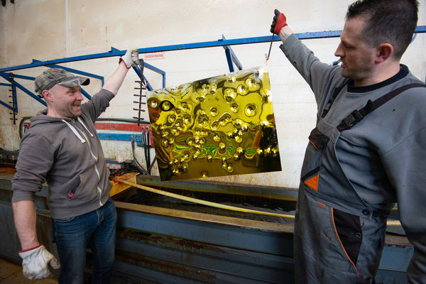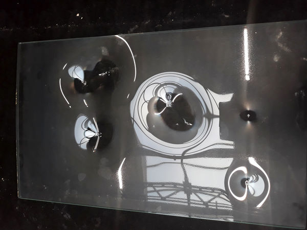 Wykorzystuję również szkło. Doskonały efekt uzyskuję formując w piecu tafle szkła. Dzięki wielu testom, we współpracy, ze specjalistami firmy Press-Glass efekt jest absolutny.